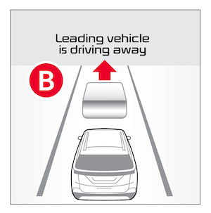 If the vehicle is stopped, and Leading Vehicle Departure Alert (LVDA) is enabled, when a detected vehicle in front starts to depart, LVDA can inform the driver sounding an alert and displaying a message