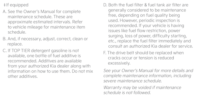 Check your Maintenance Schedule or schedule an appointment with a dealer using your Kia Connect* account by logging into your Kia Access App or your account on https://owners.Kia.com (Vehicles equipped with Kia Connect* only)