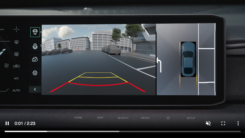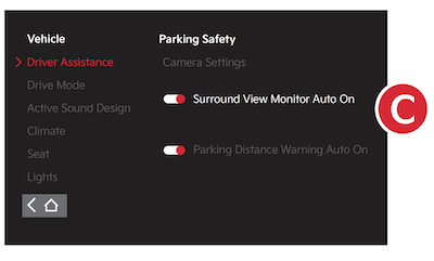SVM is a parking support system that shows the areas around the front, rear, left and right sides of the vehicle via four cameras displayed onto the Infotainment System screen.