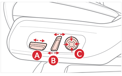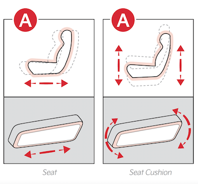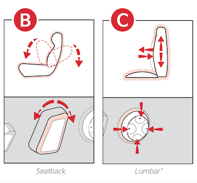 Move/Press controls to adjust Seat forward/backward, Seat Cushion up/down, Seatback recline or Lumbar up/down/ forward/backward.