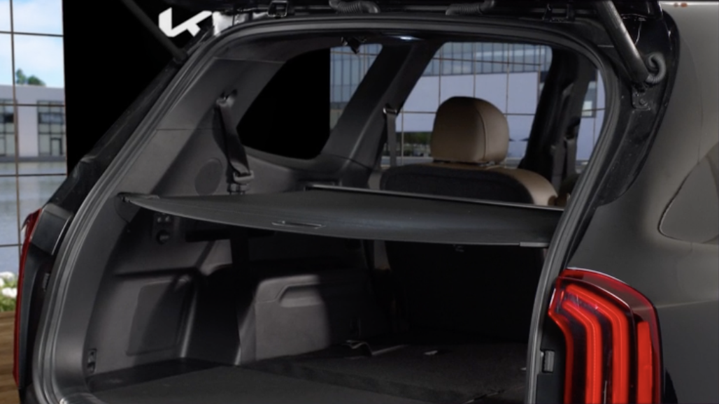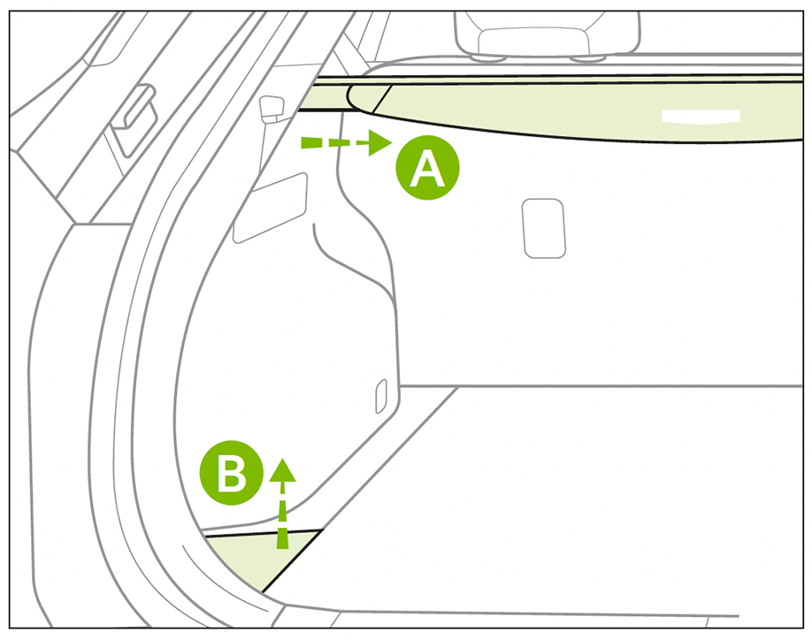 to expose the Cargo Cover storage slot. Insert the Cargo Cover on the right side first. Compress the left end of the Cargo Cover to slide it into the left slot. Replace the small storage cover and the luggage box cover.