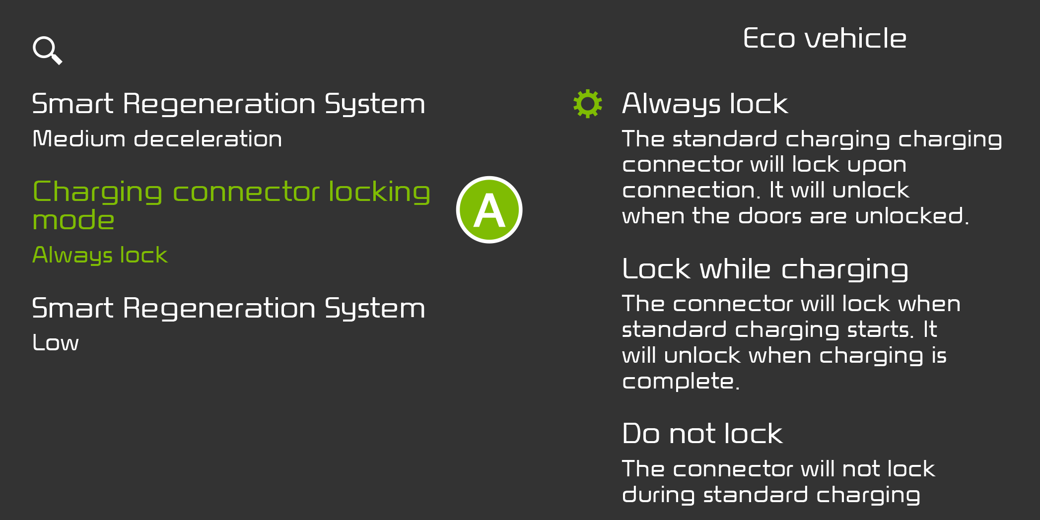 The Charging Connector can be set to various locking modes while in the charging inlet and charging (always lock, lock while charging, or do not lock).