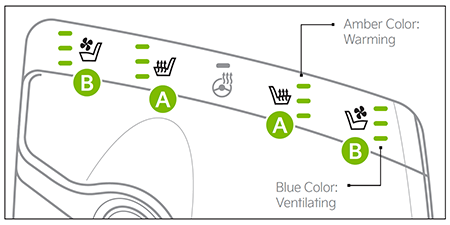 Ventilated Seats — Press the bottom of the button once for high setting (3 blue LEDs lit), again for middle setting (2 blue LEDs lit), again for low setting (1 blue LED lit). Press again to turn OFF.