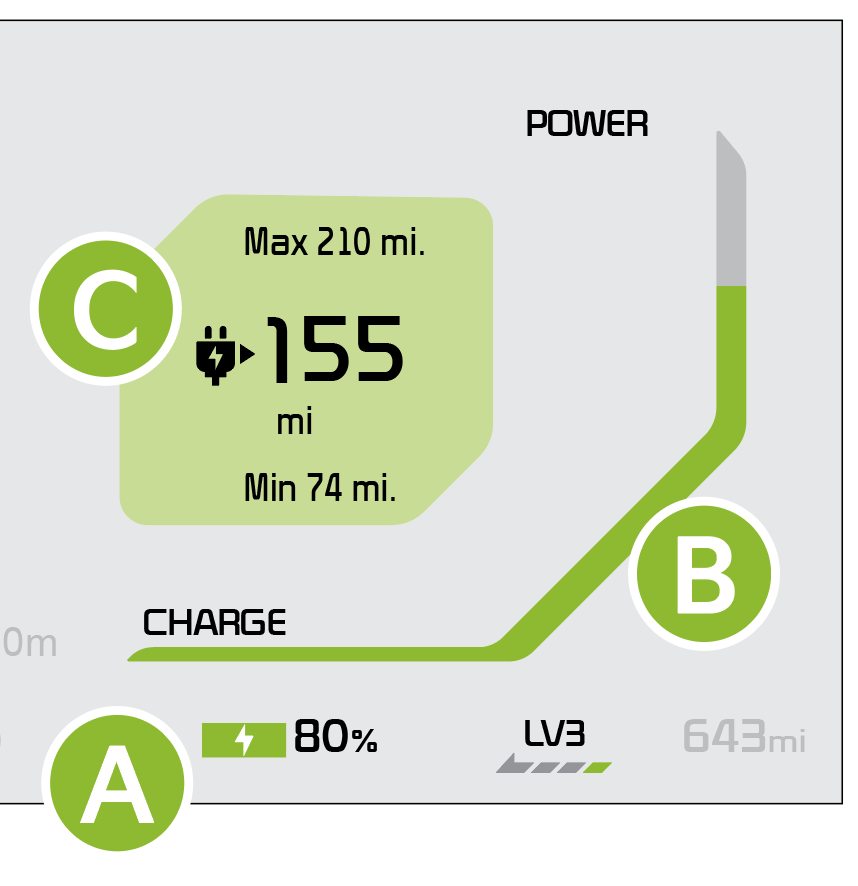 The Power / Charge gauge provides information on the energy consumption rate of the vehicle and the charge status of the regenerative brakes.