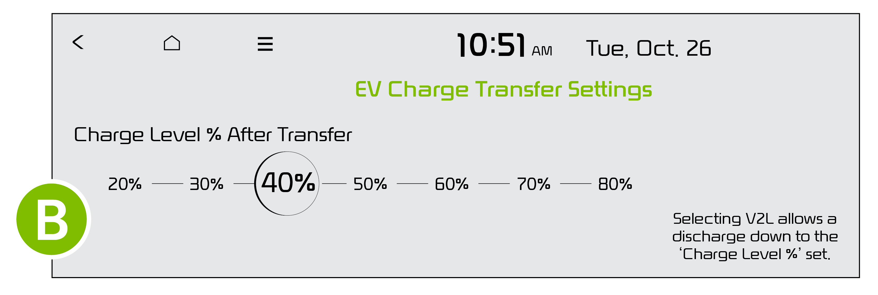 Select VEHICLE TO LOAD (V2L), and EV CHARGE TRANSFER SETTINGS