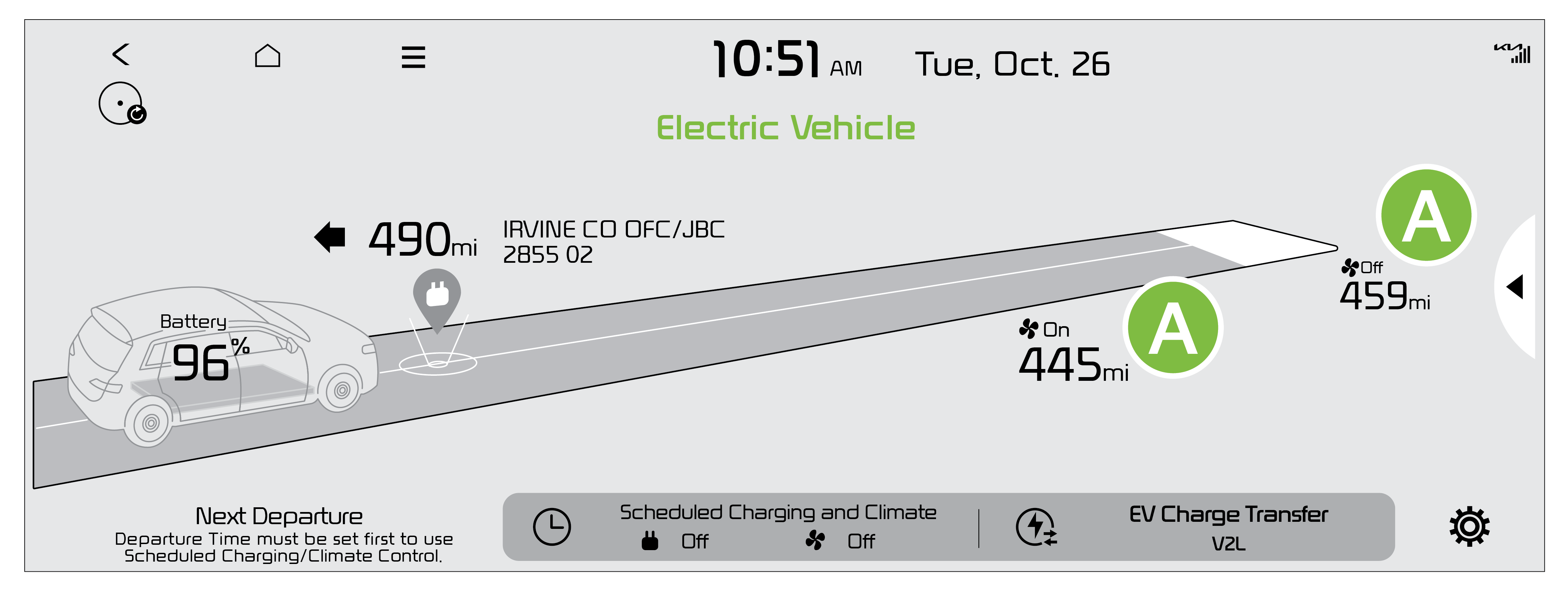 Available Range - Displays the estimated available driving distance according to the vehicle’s current location and charge amount. The first distance is with the Climate Control on. The second is with the Climate Control off.