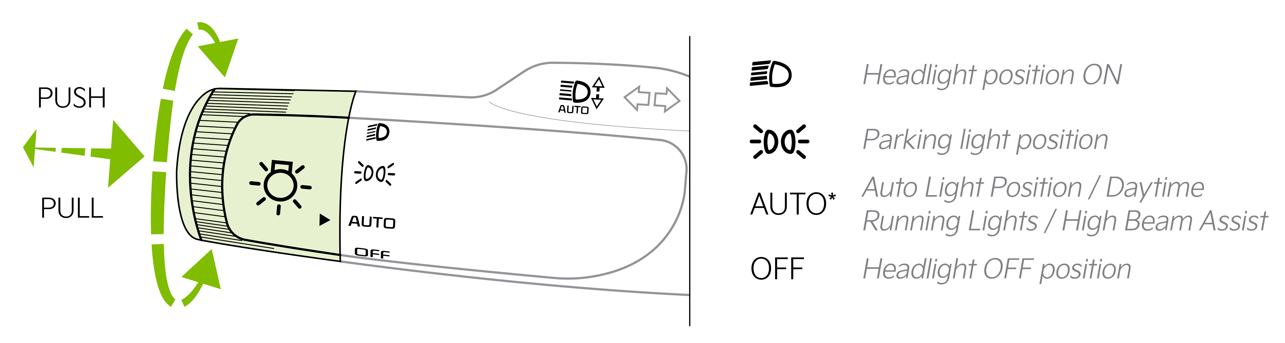 AUTO Light position – When the light switch is in the AUTO Light position, the tail lights and headlights will turn ON/OFF automatically depending on the amount of light outside the vehicle.