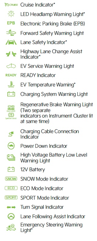 Your vehicle’s Instrument Cluster & indicator light locations may differ from those in the illustrations. Some indicators and warning lights may not appear in illustration. On the vehicle, they may appear in the LCD. For more information please refer to section 5 in the Owner’s Manual.