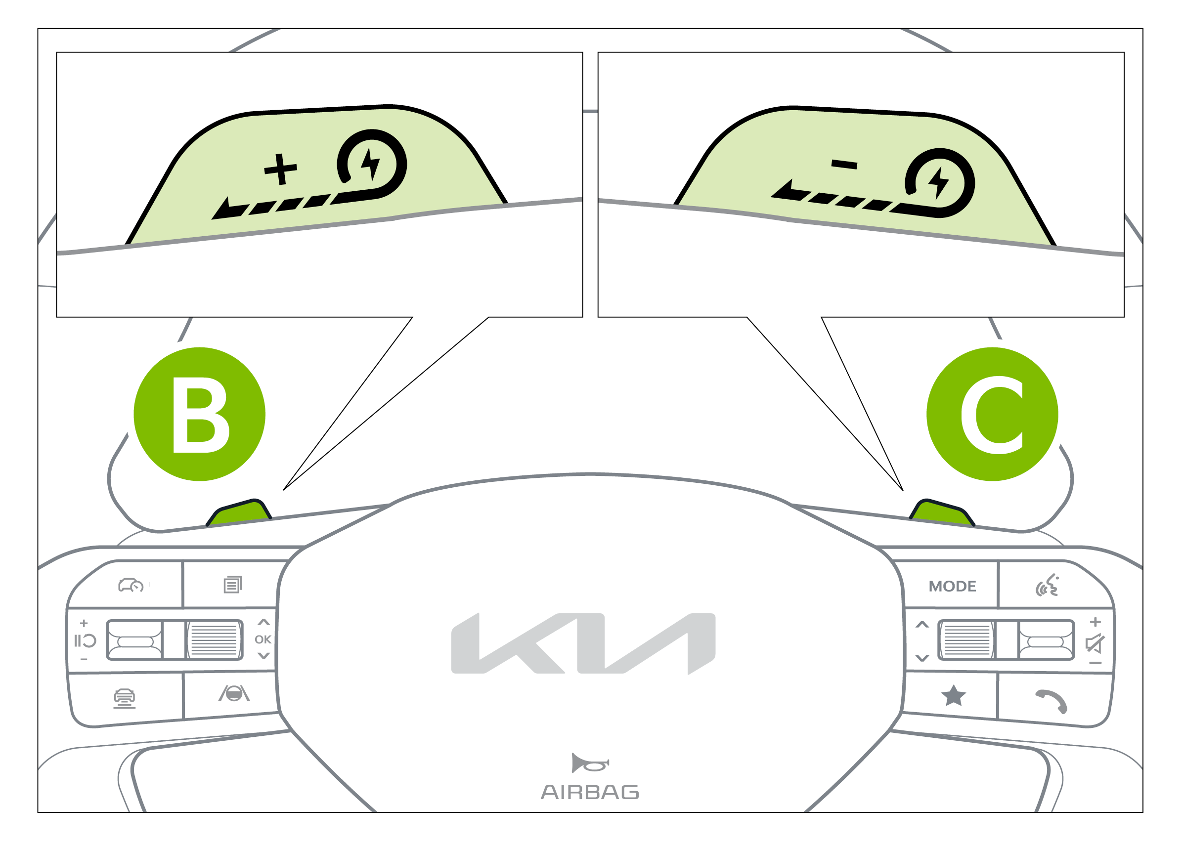 The regenerative braking system charges the battery when coasting or when you use the brakes to stop the vehicle. Use the paddle switches to adjust the regenerative braking level from 0 to 3 during decelerating or braking. The level will be displayed on the Instrument Cluster .