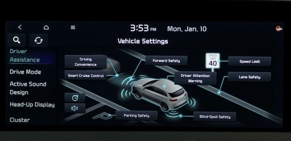 These features may not be available on all Kia models. Screen illustration is for demonstration purposes only. Some messages may appear differently. See your Owner’s Manual for more information. Driving while distracted is dangerous and should be avoided. Do not attempt to change vehicle system settings while driving. Actual vehicle settings may vary by model. For more information, refer to the Car Infotainment System Quick Reference Guide.