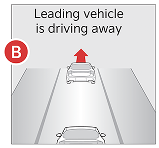 If the vehicle is stopped, and Leading Vehicle Departure Alert (LVDA) is enabled, when a detected vehicle in front starts to depart, LVDA can inform the driver sounding an alert and displaying a message