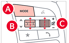 Media Modes: Press to move track up/down. Press & hold to forward/ rewind (except for Bluetooth® Audio)
