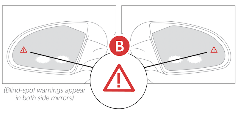 When vehicle detection warning is on and the driver activates a turn signal, a flashing indicator will illuminate on the outside rearview mirrors and BCA will sound a warning.