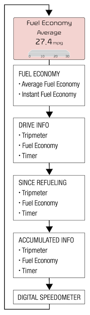 To cycle through different screens (Fuel Economy, Drive Info, Digital Speedometer, etc.) press the OK button