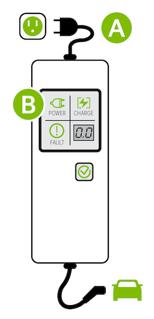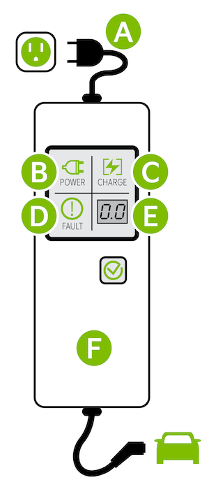 Power – When the charger and AC plug is plugged in and functioning normally, the indicator will turn green. Indicator is red if plug temperature sensor warning is present