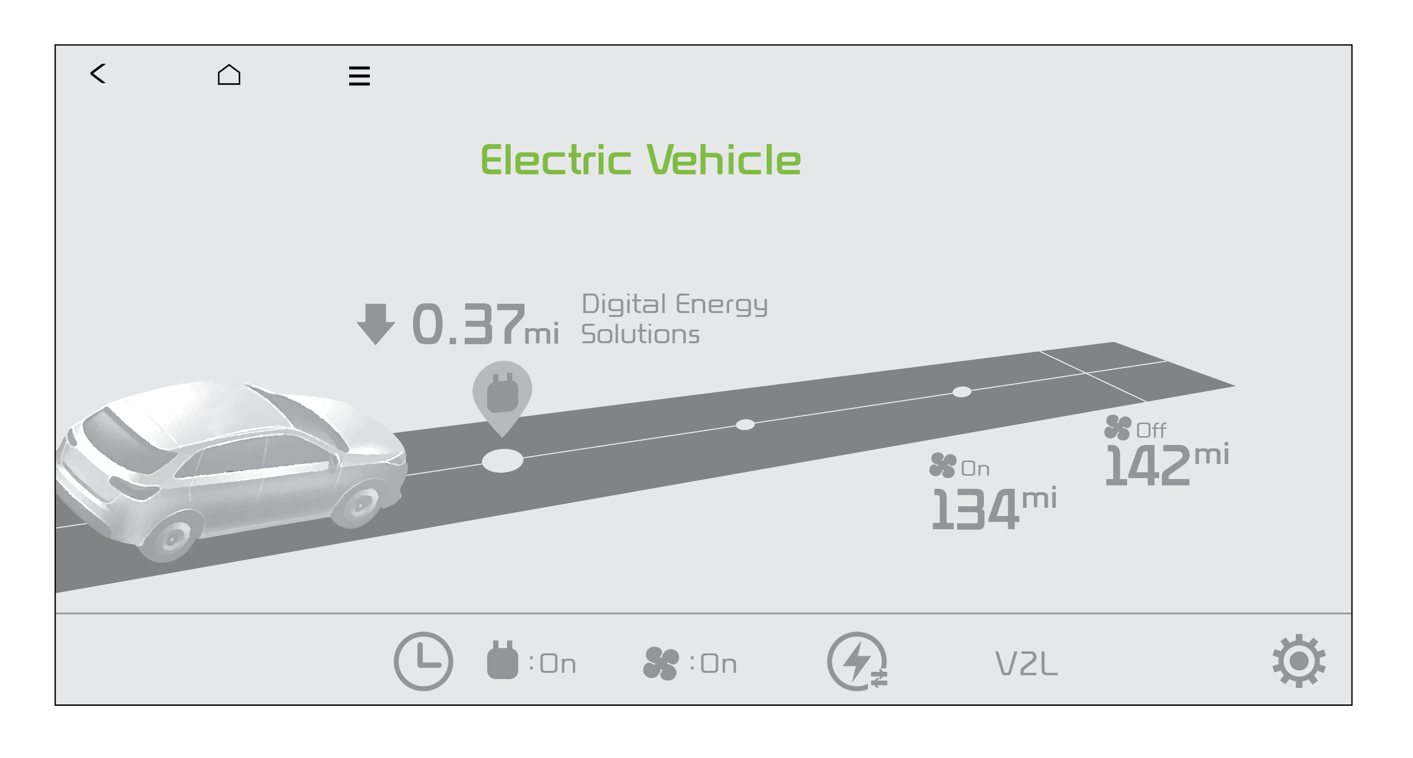 EV Mode on the Infotainment System screen allows you to navigate through menus that include information on available driving range, energy usage, energy information, charging and climate settings, and EV settings.