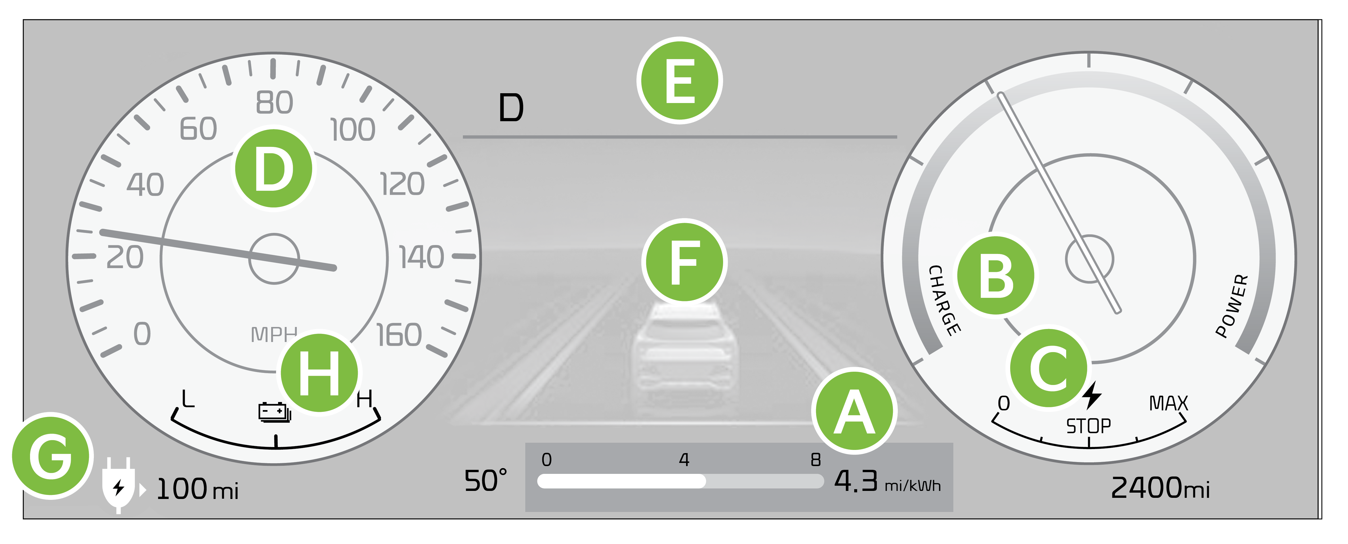 Power/Charge gauge - The energy consumption rate of the vehicle and the charge/discharge status of the regenerative brakes