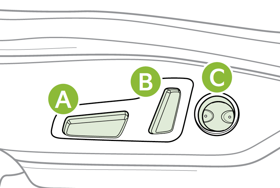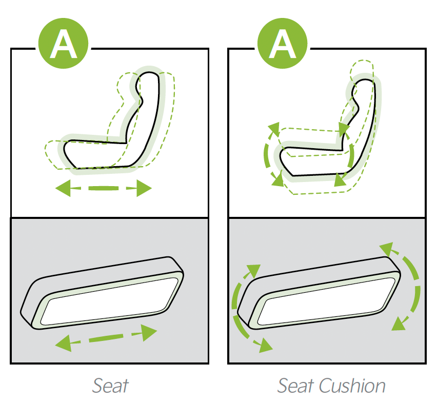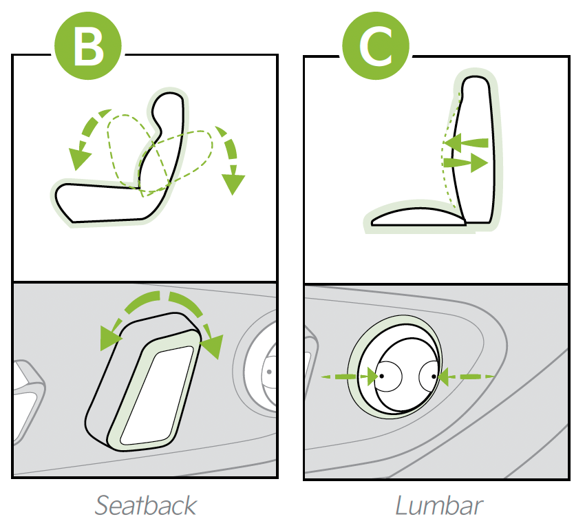 Move/Press the controls to adjust Seat forward/backward, Seat Cushion tilt up/down, Seatback forward/backward or Lumbar forward/backward.