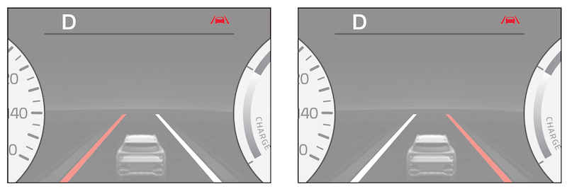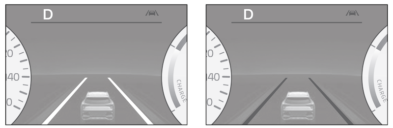 up/down to toggle to Driver Assistance, Driving Safety and then Lane SafetyWhen LKA detects the lane markers, both lanes are displayed white (below left). Lane safety symbol may illuminate green. When LKA does not detect the lane markers, the lanes are displayed gray (below right).