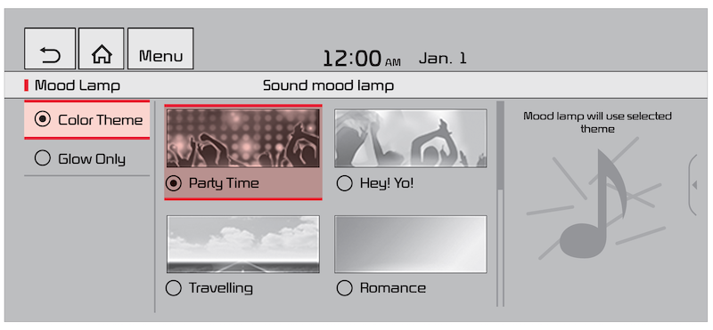 The vehicle’s speaker lights can be customized, including setting the lights to change according to the mood of the music playing.