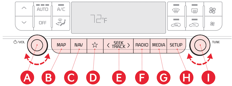 In Radio/SiriusXM®/Media modes, rotate knob to search for stations/ channels/tracks/songs/files. Press the knob to receive the selected channel/track/song/file