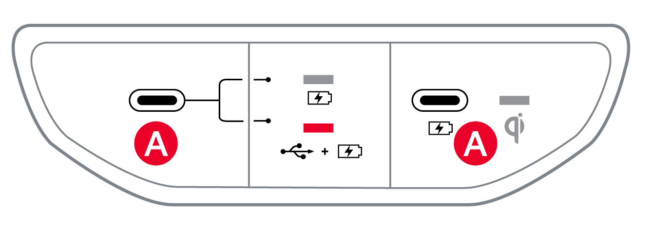 USB-C charger ports: are located in the Center Panel, inside and on the back of the Center Console.