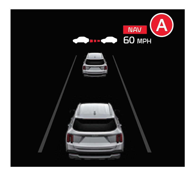 With SCC turned on and activated, the vehicle distance set, and the system detects a vehicle slowing or stopping, the system can bring the vehicle to a complete stop. When the vehicle ahead starts to move forward, SCC re-engages. If the vehicle ahead stops for more than 3 seconds, the accelerator pedal or the