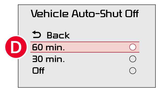 The Vehicle Auto-Shut Off, when certain conditions are met, will turn the vehicle off automatically after a pre-set time (30 or 60 minutes).