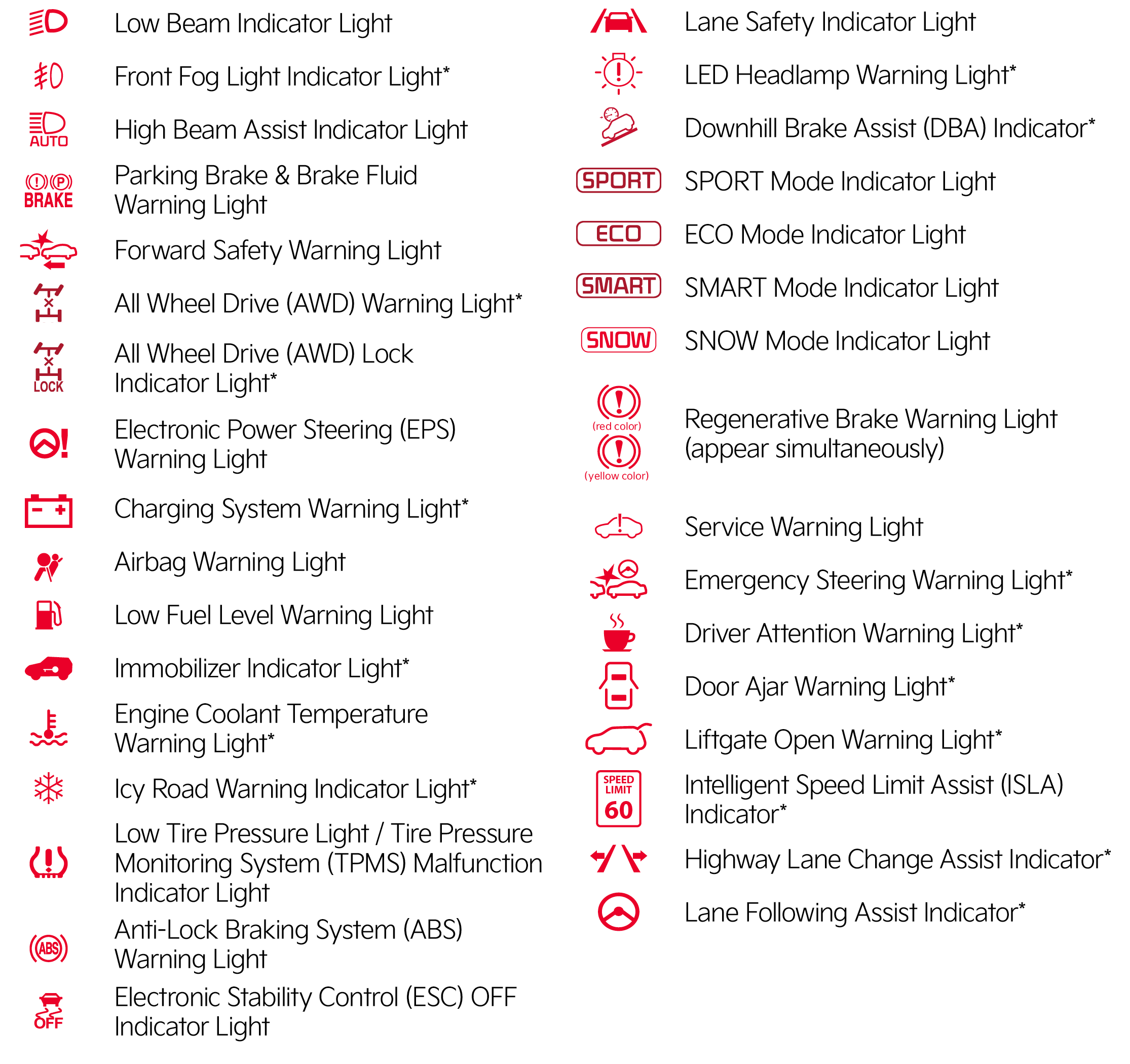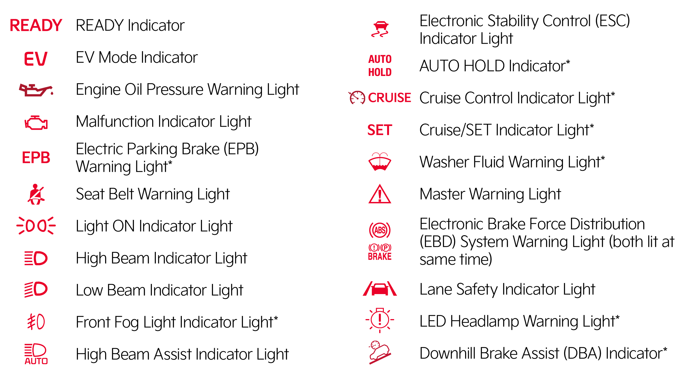 Your vehicle’s Instrument Cluster & indicator light locations may differ from those in the illustrations. Some indicators and warning lights may not appear in illustration. On the vehicle, they may appear in the LCD. For more information please refer to section 5 in the Owner’s Manual.