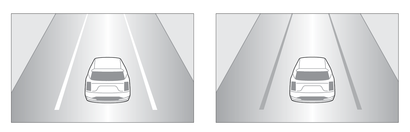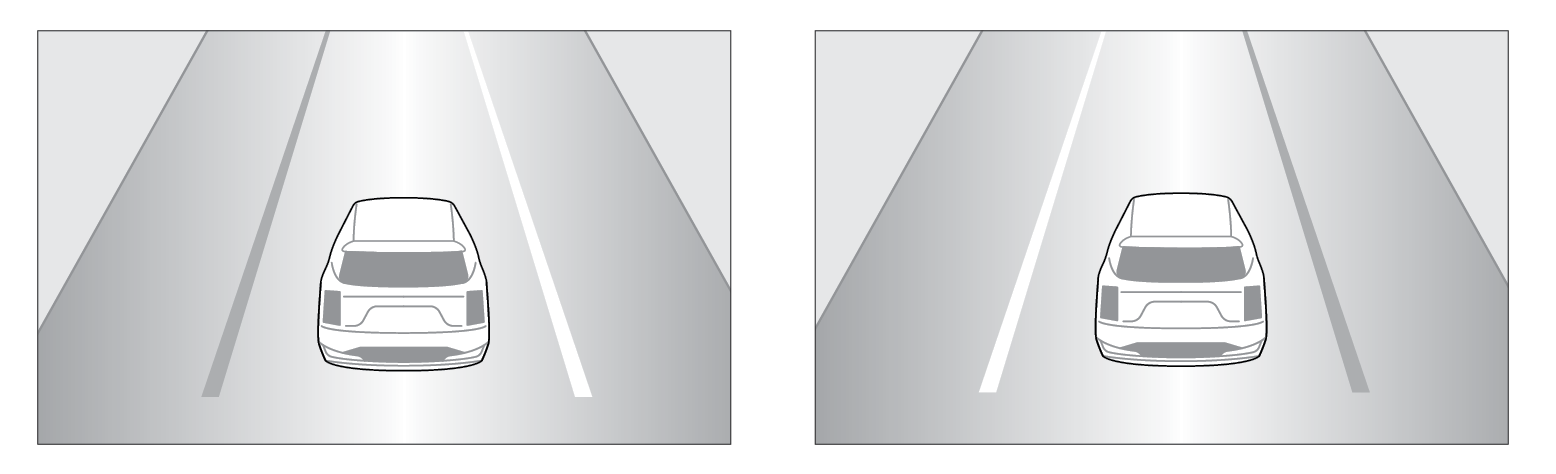 When the front-view camera detects the vehicle moving outside of the lane being traveled in, a yellow marker will illuminate either on the left or right lane (shown in both images above).