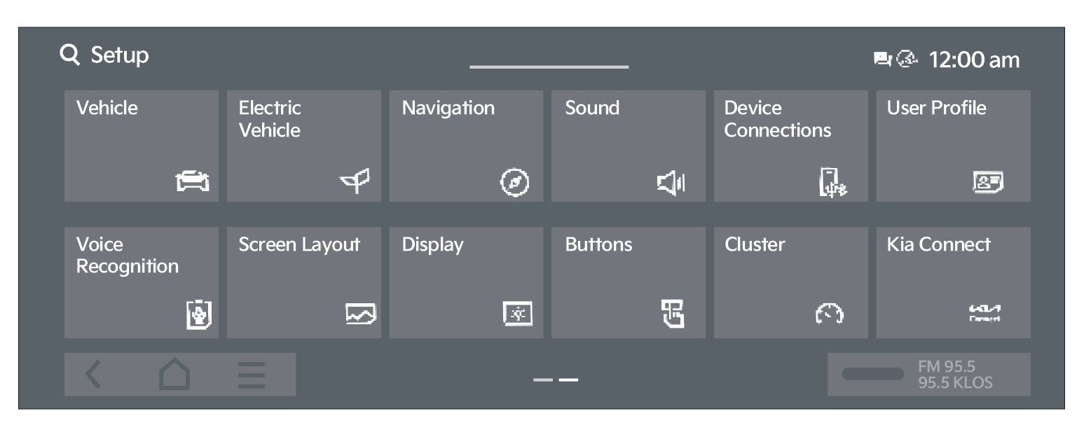 To enter the Vehicle Settings mode in the Infotainment System, press the SETUP button/key on the Infotainment System. Then press Vehicle