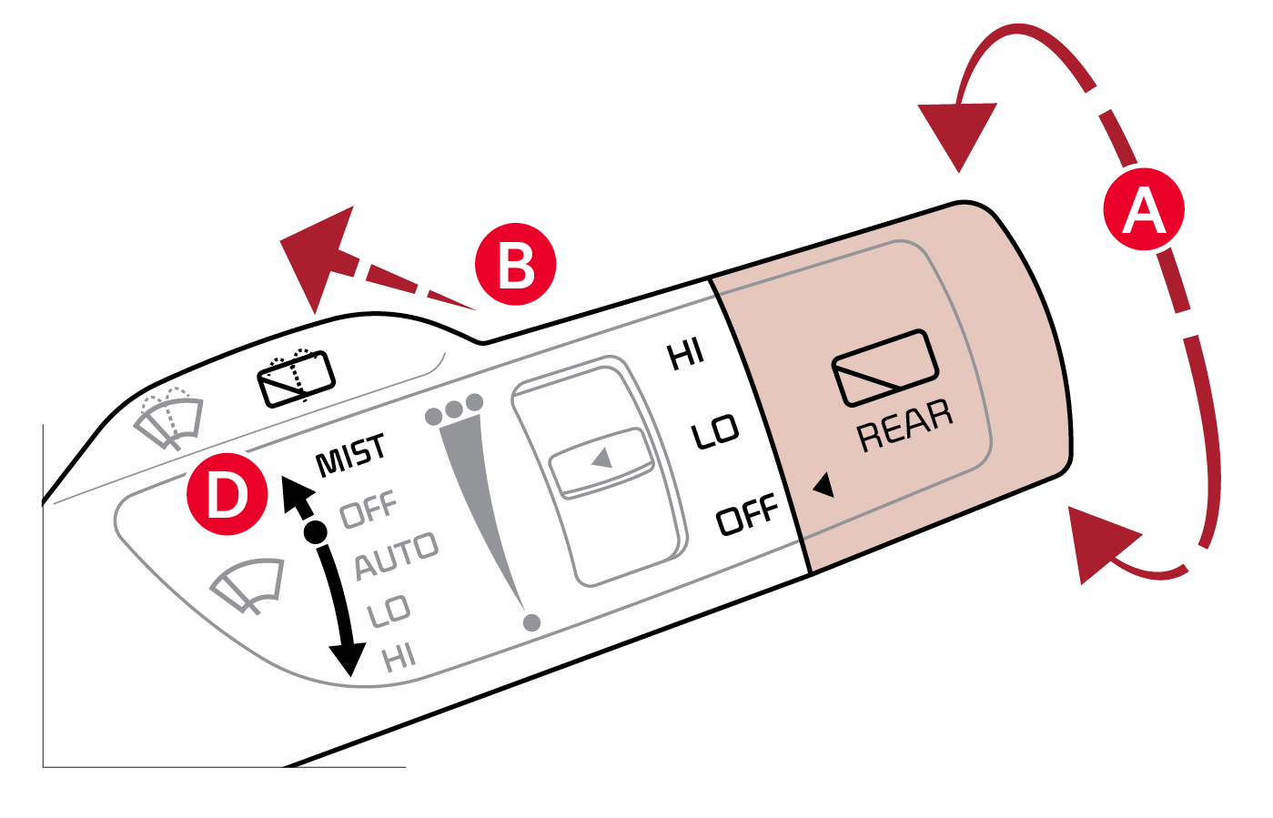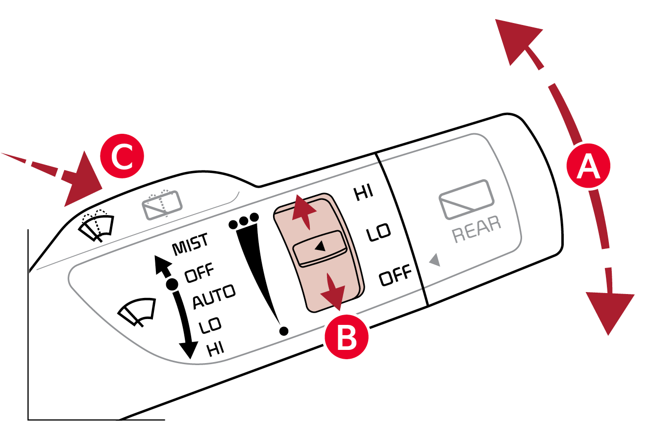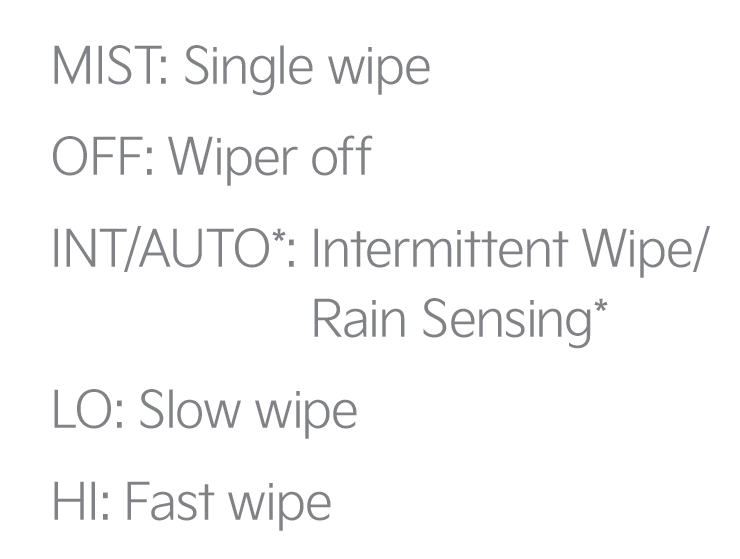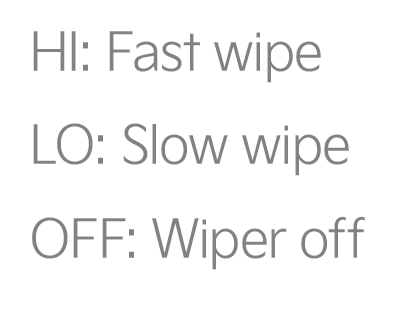 up increases intermittent wipe frequency and wipe speed. Moving switch down decreases frequency of wipesTo operate: