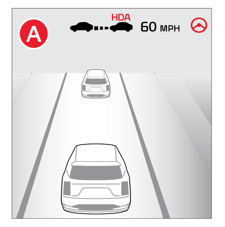 When HDA2 is activated and the conditions are met, the Instrument Cluster indicator will illuminate green. If the conditions are not met, HDA2 will be in standby mode and the indicator light will illuminate gray. When in operation, and if both lanes are recognized, the Instrument Cluster will show the lanes illuminated white and the HDA2 indicator illuminated green .