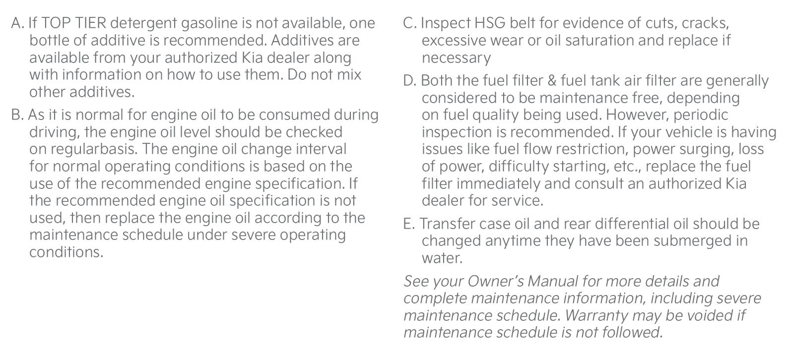 Check your Maintenance Schedule or schedule an appointment with a dealer using your Kia Connect* account by logging into your Kia Access App or your account on https://owners.Kia.com (Vehicles equipped with Kia Connect* only)