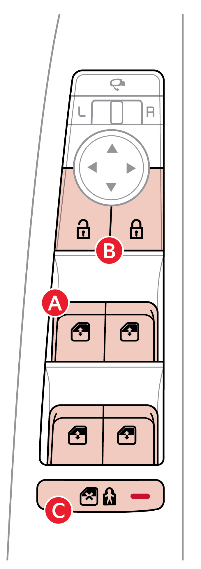 • When button is pressed, window controls for the Rear Passenger Windows are disabled