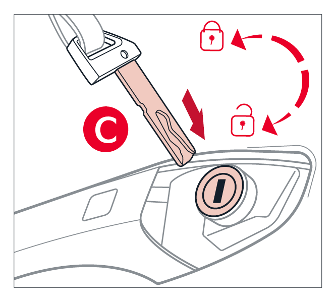 Mechanical Key: Use to lock/unlock Driver’s Door by turning once or all doors by turning twice. Use to enable/disable Child Safety Locks, and to unlatch rear center seatbelt lower anchor