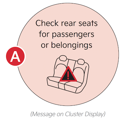 Rear Occupant Alert (ROA) with Door Monitoring may help alert the driver when a rear passenger may be left in the vehicle. The alert will be a message on the Instrument Cluster stating to “Check rear seats”