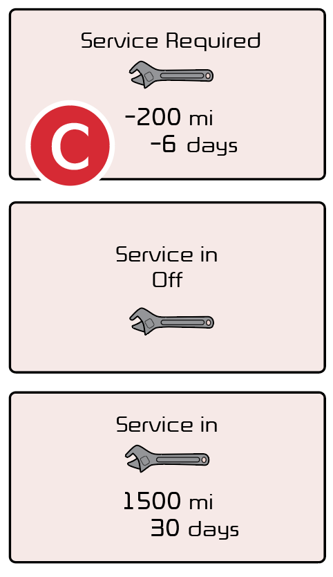 . System will display tire pressure status, number of miles remaining until next service is due, as well as the type of service due.