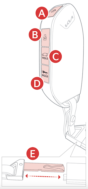 Remote button configuration may vary depending on vehicle options. For more information on the Mechanical Key, please refer to section 4 in the Owner’s Manual. Do not use remote climate control or remote start if vehicle is in an enclosed area (e.g., closed garage) or a partially enclosed area without ventilation. Close all doors leading from adjacent living areas to the vehicle area before executing a remote climate control or remote start command.