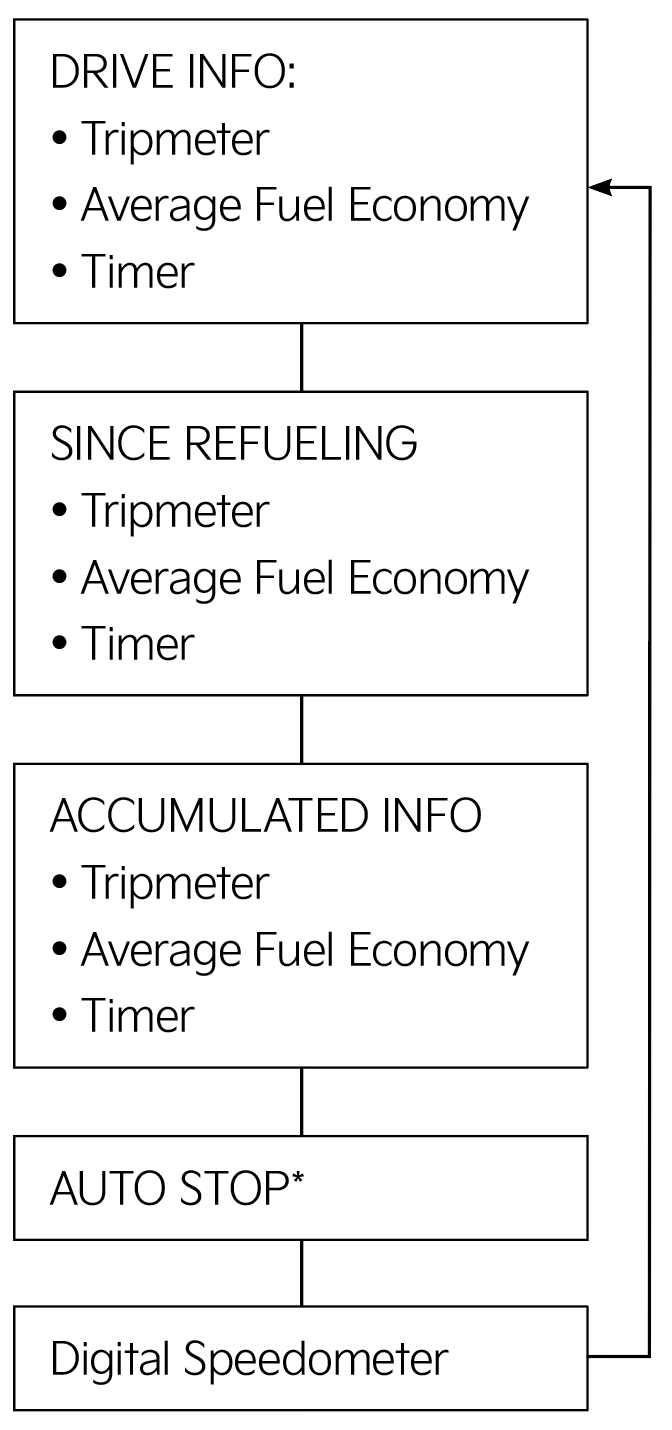 To cycle through the different Instrument Cluster’s LCD Modes, press the Mode button ![]()