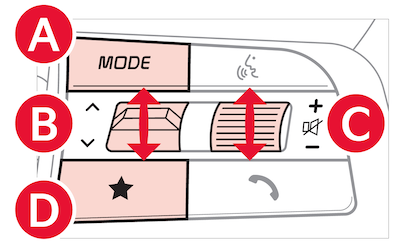 Media Modes: Press to move Track Forward/Back. Press & hold to Fast Forward/Rewind (except for Bluetooth® Audio)