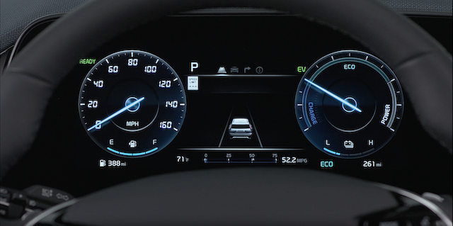 To enter the Hybrid display mode, press the HEV button on the Infotainment System’s home screen.Then select one of the menus: EV Range, Energy Information, Charge Management, ECO Driving, Energy Flow.