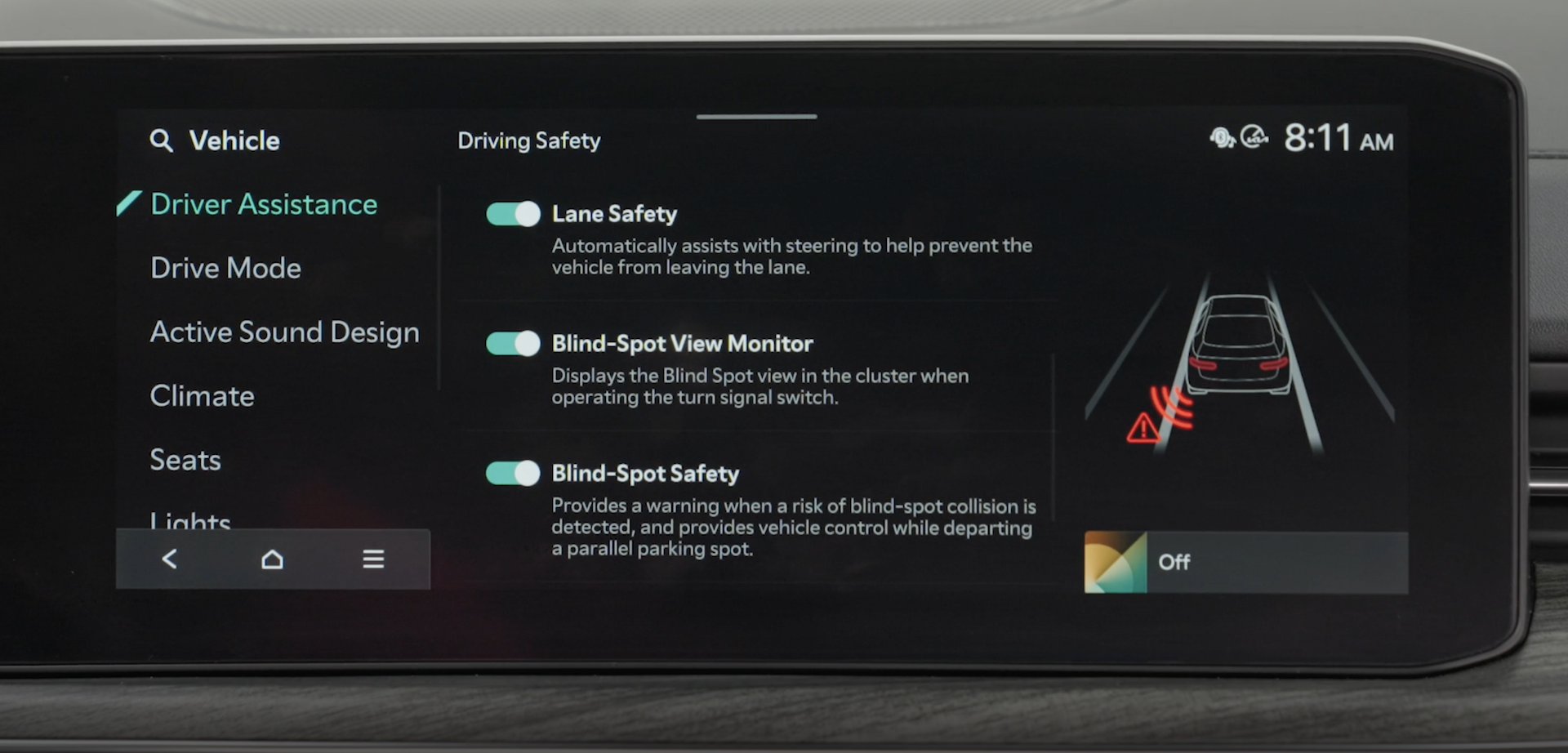 In Driver Assistance, select Driving Safety, and then you may select Forward Safety, Forward Cross-Traffic Safety, and Forward/Side Safety.