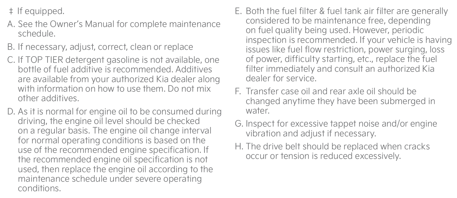 Check your Maintenance Schedule or schedule an appointment with a dealer using your Kia Connect* account by logging into your Kia Access App or your account on https://owners.Kia.com (Vehicles equipped with Kia Connect* only)