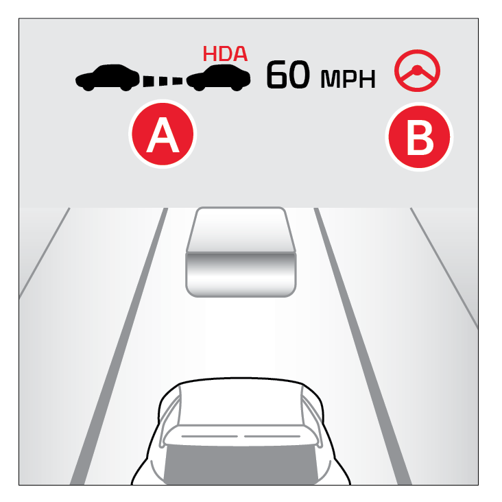 When HDA is operating, your vehicle will stop if the vehicle ahead of you stops. Also, if the vehicle ahead of you starts moving within approximately 30 seconds after the stop, your vehicle will start to move as well.