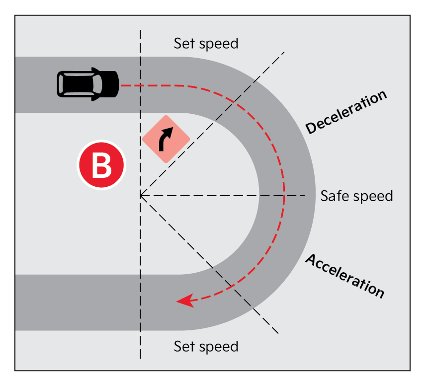 activates and reduces the vehicle speed through the curve. When the vehicle passes the curved road, the vehicle may return to its previously set SCC speed.